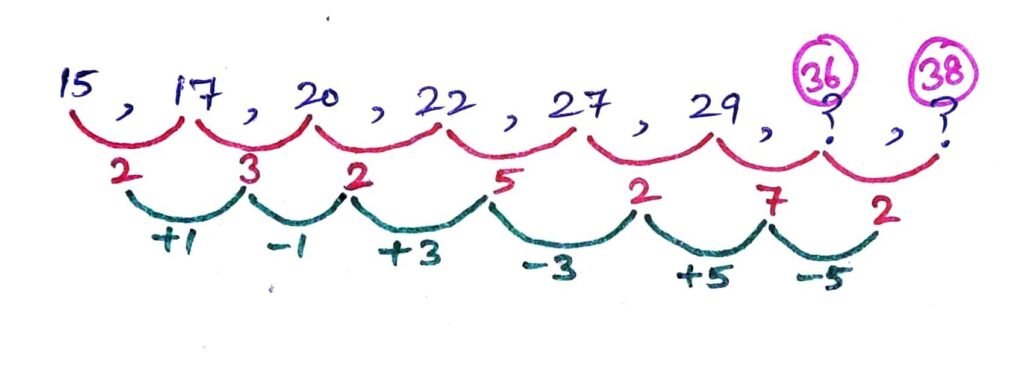 15, 17, 20, 22, 27, 29, ? , ?