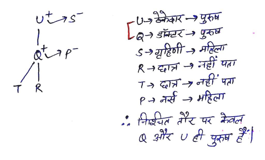 Q14. एक परिवार में छह सदस्य P, Q, R, S, T और U हैं। दो विवाहित जोड़े हैं। Q एक डॉक्टर है और T का पिता है। U, R का दादा है और एक ठेकेदार है। S, T की दादी है और एक गृहिणी है। परिवार में एक डॉक्टर, एक ठेकेदार, एक नर्स, एक गृहिणी और दो छात्र हैं। निम्नलिखित में से कौन निश्चित रूप से पुरुष सदस्यों का समूह है?