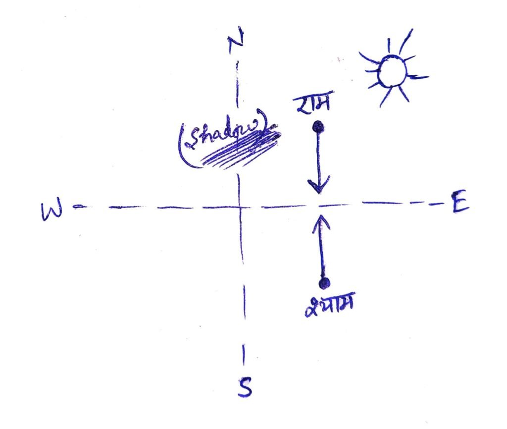 Q15. एक सुबह दो दोस्त राम और श्याम एक-दूसरे के सामने एक बगीचे में इस प्रकार खड़े थे कि राम की छाया श्याम के बाईं ओर पड़ती है। राम किस दिशा के सम्मुख है?