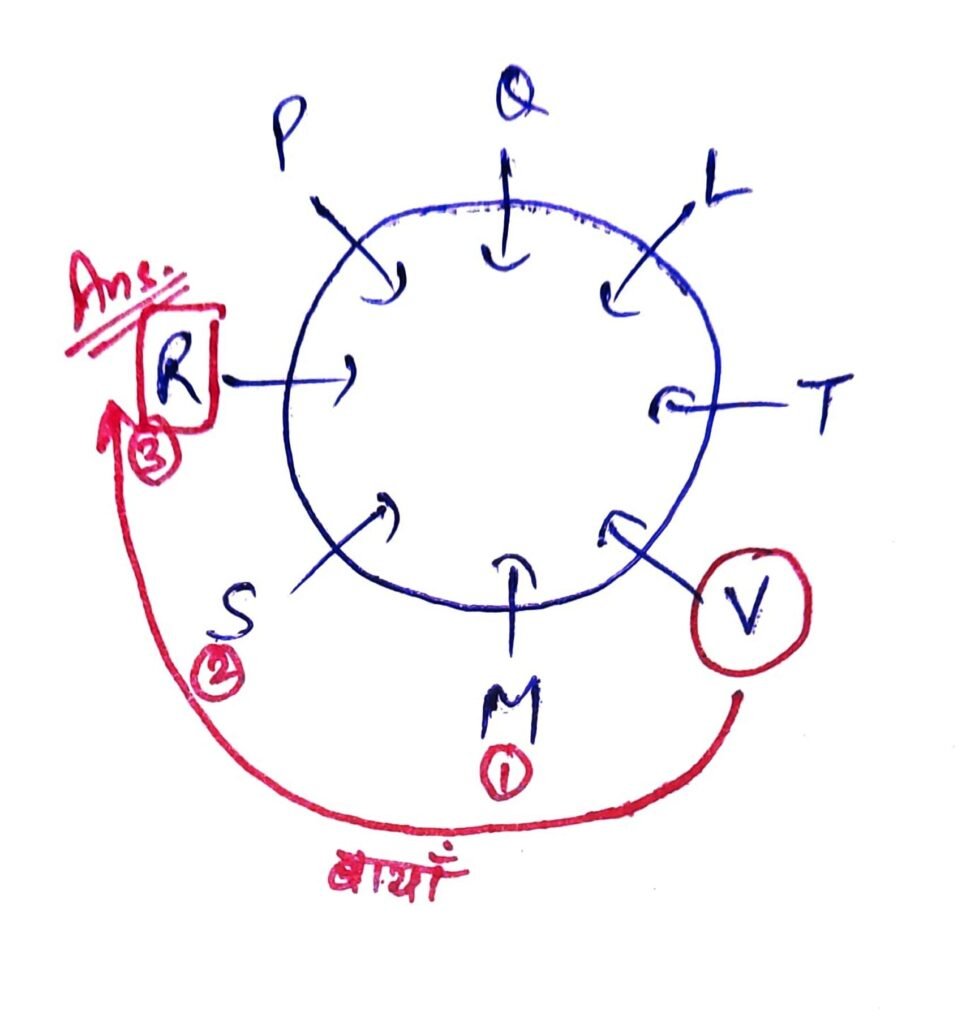 Q19. आठ मित्र L, M, P, Q, R, S, T और V केन्द्र की ओर मुंह करके एक वृत्त के गिर्द बैठे हैं। L, M के दाएं को तीसरे स्थान पर बैठा है और L, P के बाएं को दूसरे स्थान पर बैठा है। R व S एक-दूसरे के बाद बैठे हैं और उनमें से कोई भी L का निकटस्थ पड़ोसी नहीं है। Q, T के दाएं को दूसरे स्थान पर बैठा है। V, S के दाएं को दूसरे स्थान पर बैठा है।
