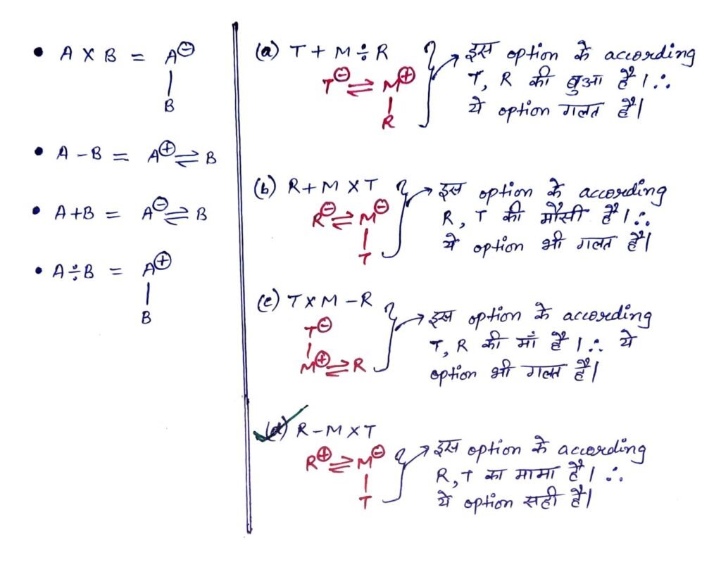 Q3. ‘A × B’ का अर्थ है ‘A, B की माँ है’। ‘A – B’ का अर्थ है ‘A, B का भाई है’। ‘A + B’ का अर्थ है ‘A, B की बहन है’। ‘A ÷ B’ का अर्थ है ‘A, B का पिता है’। निम्नलिखित में से किसका अर्थ है ‘R, T का मामा है’?