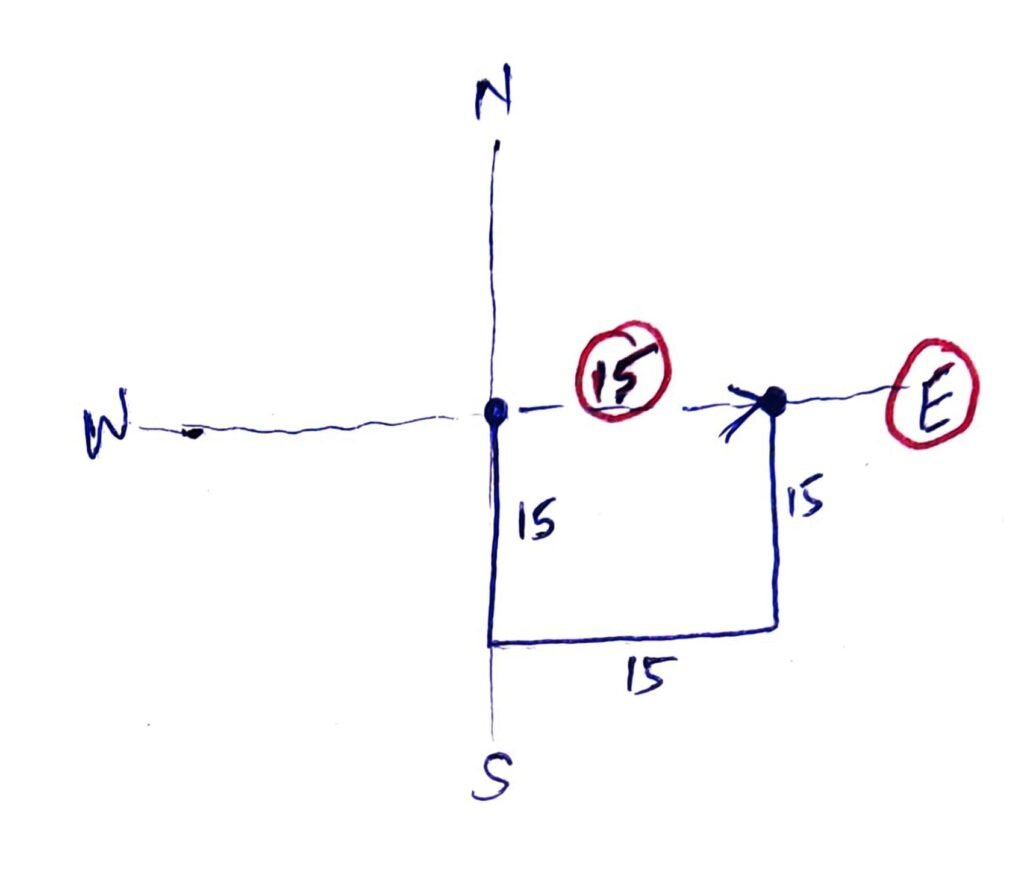 Q8. शारदा ने दक्षिण दिशा में चलना शुरू किया, 15 मीटर चलने के बाद वह दो बार अपने बाएँ घूमी और दोनों बार 15-15 मीटर चली, अब वह अपने प्रस्थान स्थल से कितनी दूर है और किस दिशा में है?